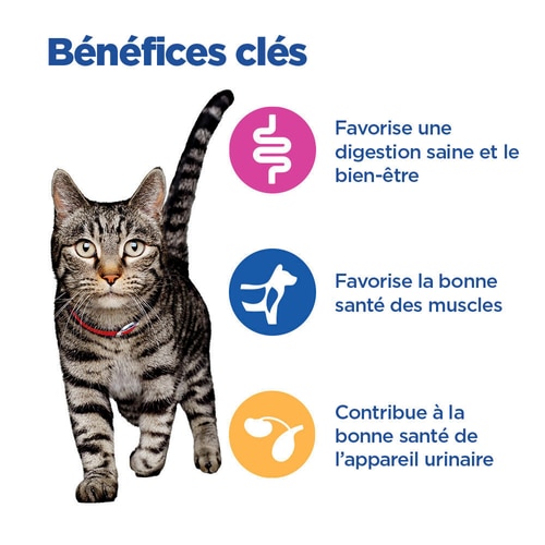 Hill's VET ESSENTIALS MULTI-BENEFIT Adult 1-6 ans Croquettes pour Chat au Poulet est une nutrition disponible exclusivement chez les vétérinaires, aux bénéfices multiples cliniquement prouvés pour soutenir la digestion et le bien-être. Formulé avec des protéines de haute qualité pour soutenir la santé musculaire et une teneur contrôlée en magnésium, phosphore et calcium pour un système urinaire sain. — Un goût délicieux, pour un meilleur quotidien, aujourd'hui et demain.